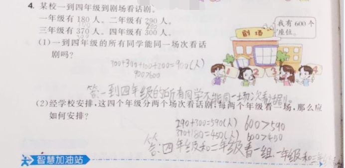 (1)一至四年级所有同学能同一场次看话剧吗?
